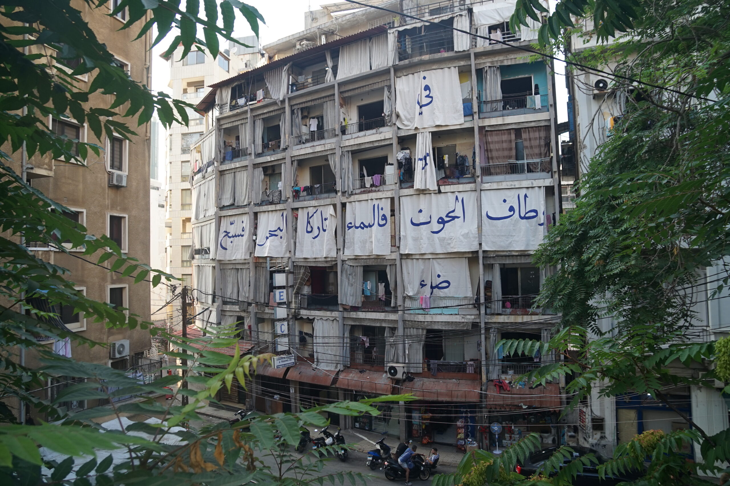 The Letco Star Hotel is situated in Ain El Mrayse in central Beirut, the building stands as a peripheral entity—a low-income rental housing with converted hotel rooms that accommodate multiple renters, including entire families. The artist worked with a group of the residents in the aim of constructing a collective poem and printing it on the balconies curtains.